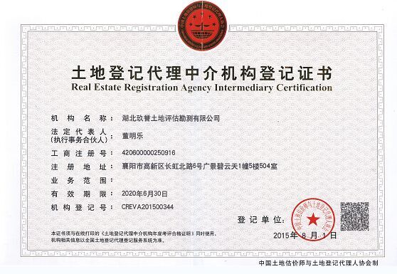 2015年8月,经过中国土地估价师与土地登记代理人协会的核准,湖北玖誉土地评估勘测有限公司荣获“土地登记代理中介机构登记证书”,标志着玖誉评估正式进入土地登记代理活动领域,进一步拓展了公司的业务范围,增强了企业的综合实力。