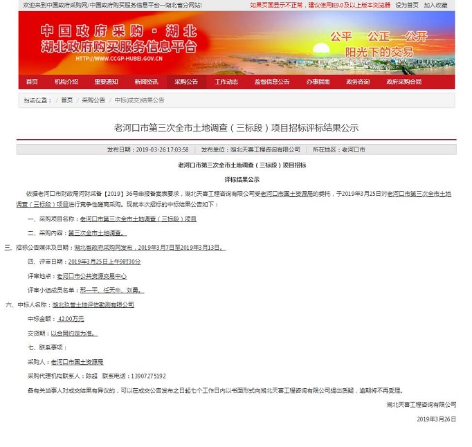 2019年3月25日老河口市进行第三次全市土地调查(三标段)项目,湖北玖誉土地评估勘测有限公司成功中标,中标金额人民币肆拾贰万元(¥42万元整)。
